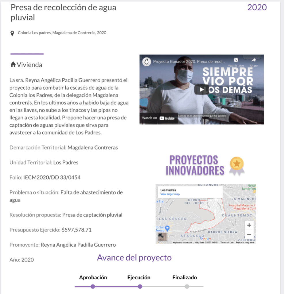 Facilidad para proponer y consultar proyectos de Presupuesto Participativo. Los proyectos podrán registrarse y ubicarse a través de georreferenciación, para facilitar su identificación. Se permitirá la revisión actual e histórica (desde 2011, año de inició del mecanismo) de los montos destinados a cada proyecto, su evolución con el paso del tiempo y la consulta de imágenes o videos que ilustren su ejecución.