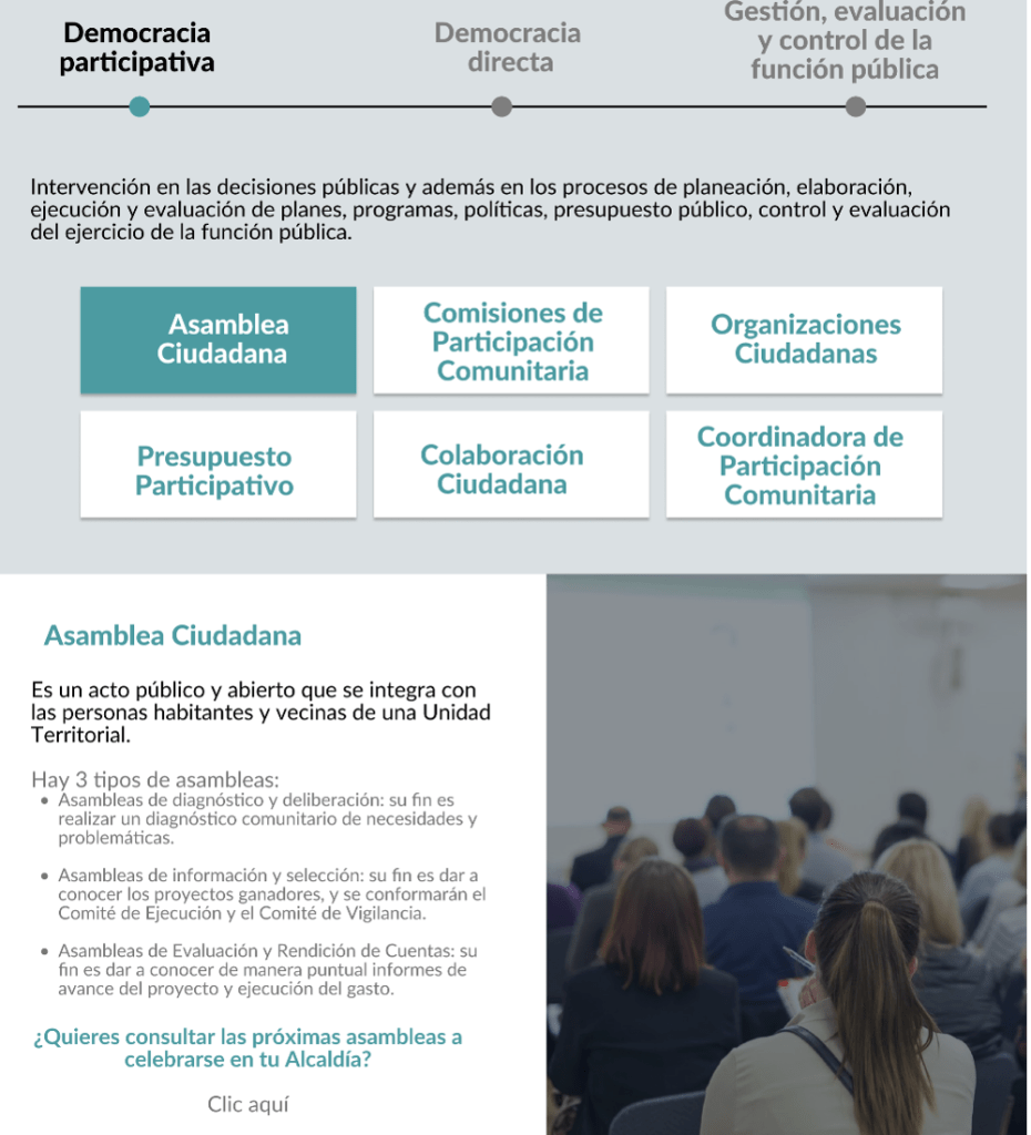 - Navegación por los tipos de democracia reconocidos en las normas de la CDMX: democracia participativa, democracia directa y gestión, evaluación y control de la función pública (Imagen 3).